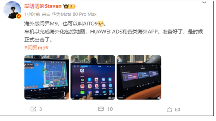 车家号·0浏览·2025-12-04 15:36 · 广东12 月 2 日消息,今日下午,博主“爱叨叨的 Steven”分享了海外版问界 M9(或名 AITO9)的车机系统,并表示车机已完成海外化,包括地图、HUAWEI ADS 和各类海外 app 的本地化适配。
