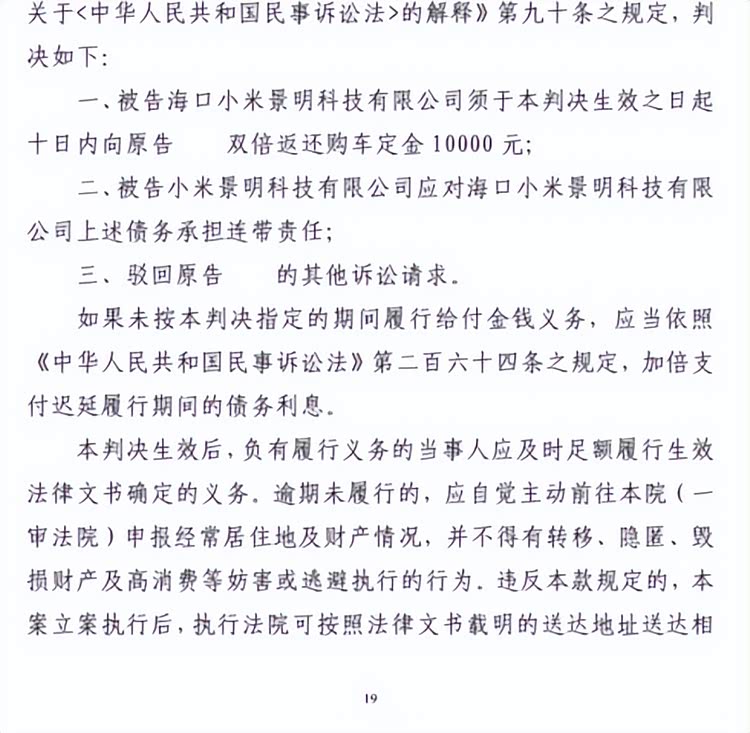 而海口市美兰区人民法院在这一案件中判决小米汽车向消费者双倍返还定金共10000元。从司法判决的角度上一定程度否定了小米汽车“未验车催缴尾款”的合法性。