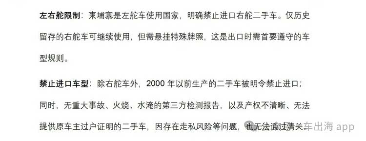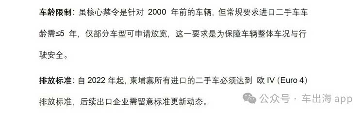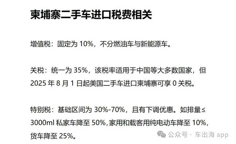 关税:常规税率为35%,但针对美国的二手车贸易实施0关税政策,这一差异化政策源于柬埔寨与美国的贸易协定。