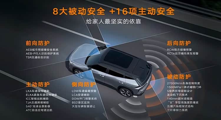 1500MPa硼钢构建被动安全壁垒,车身关键部位采用一体式热成型硼钢门环,硬度相当于普通钢材的5倍,配合27000N·m/°的超高车身扭转刚度,碰撞时能牢牢保护乘员舱空间不变形。五横六纵框架式结构、140mm超长吸能盒与三叶草卸力系统,还能层层分散冲击力,最大程度降低碰撞伤害,就像给车辆穿上“防护铠甲”。
