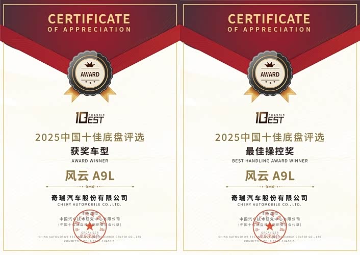 2025年9月9日,历时5个月之久的中国十佳底盘评选终于公布结果,而 风云A9L(参数|询价)凭借卓越的底盘技术和操控性能在该项目主客观测试中脱颖而出,一举拿下“2025年中国十佳底盘”综合奖与“最佳操控奖”单项奖。