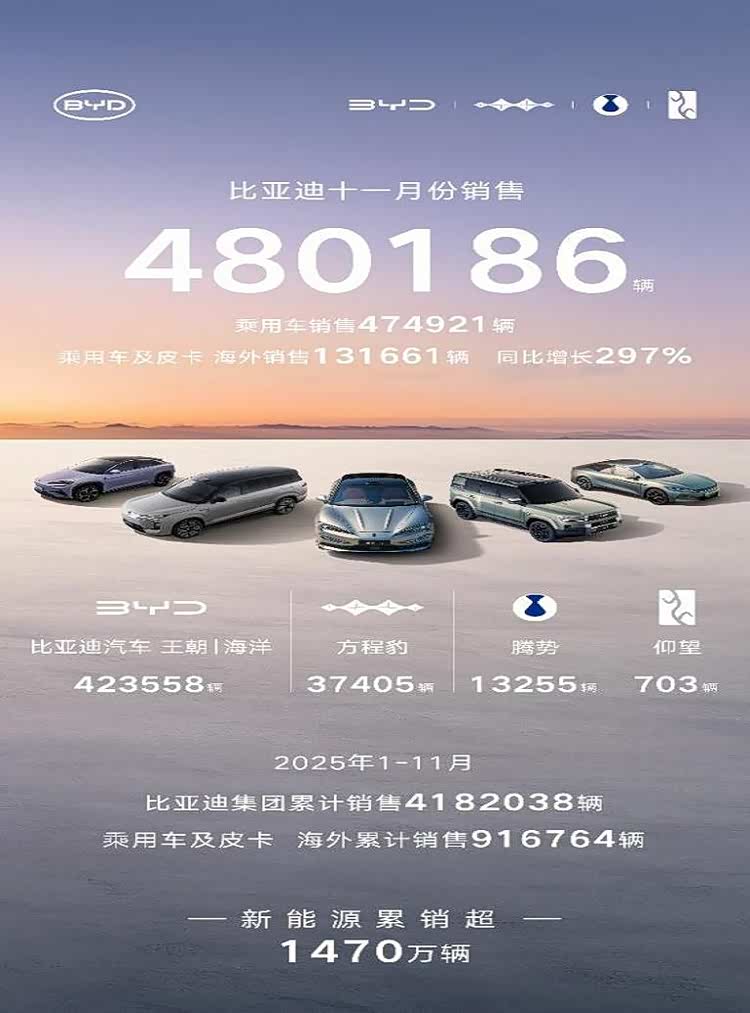 提起比亚迪,其市场表现始终是关注焦点。2025年11月份比亚迪销量延续强劲势头,单月销量突破48万辆大关,创下年内新高,而1月至11月比亚迪累计销量已稳健迈过418万辆,在全球新能源汽车格局中占据显著身位。但销量冠军的光环,有时反而会让人忽略它更核心的特质:比亚迪不只是卖车厉害,它更像一个总在“第一个吃螃蟹”的新能源行业的技术先锋。