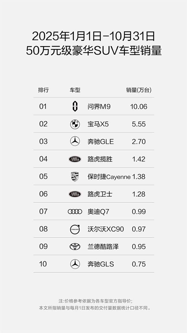 第一重王冠是销量统治力。 在传统豪华品牌最为看重的50万级SUV市场,问界M9仅用不到两年时间就完成了从破局者到统治者的转变。2025年1-10月累计 10.06万辆 的销量,不仅让它稳居细分市场第一,更向整个行业发出了明确信号:高端消费者对豪华的认知正在发生根本性转变。全系累计交付突破 26万辆的里程碑,则进一步印证了这种转变的广泛性与持续性,更为问界品牌整体“量价齐飞”提供了顶层支撑。
