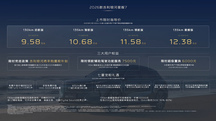 纵观2026款银河星舰7的上市,其意义远不止于发布一款新车。它通过精准的配置划分、扎实的全系标配以及富有诚意的价格权益组合,清晰地传递出一个信号:在十万元级别市场,消费者理应享受到更安全、更智能、更舒适的产品。从9.58万元起的限时售价,到层层递进的实用升级点,这款车正试图为用户勾勒出一幅更具获得感的价值蓝图。