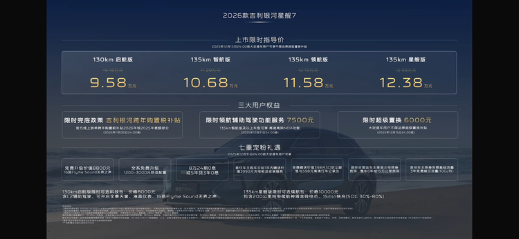 2026款星舰7 EM-i的定价策略直击市场心脏。9.58万元的起售价不仅进入了传统燃油SUV的领地,更让同级新能源对手感受到了压力。官方推出四个版型,从130km启航版到135km星舰版,价格梯度合理,满足不同预算消费者的需求。限时优惠政策将持续到12月31日,叠加6000元置换补贴、7500元智能驾驶服务包和购置税兜底政策后,实际购车门槛进一步降低。
