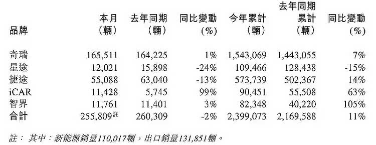 其中奇瑞品牌11月份的销量为165511辆,相比去年同期销量164225辆,同比增长1%。与此同时今年1-11月份,奇瑞品牌的累计销量为1543069辆,相比去年同期累计销量1443055辆,同比增长7%;