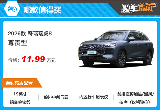 在国内中型SUV市场, 奇瑞瑞虎8(参数|询价)凭借多年深耕与持续创新,积累了深厚的产品底蕴以及广泛的市场认可,经过多次更新升级,如今已经来到第五代车型。不久前,2026款奇瑞瑞虎8强势登场,无论颜值、配置还是动力表现,相较此前都明显更具竞争力。对于这样一款面向家用市场的实用主义中型SUV,究竟哪款配置最值得入手?本期《购车指南》为您解答。