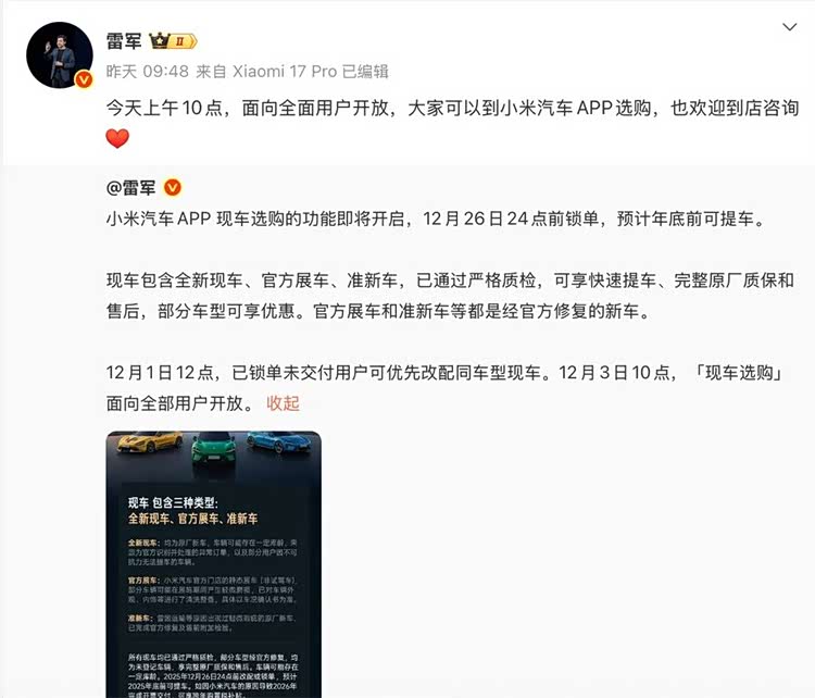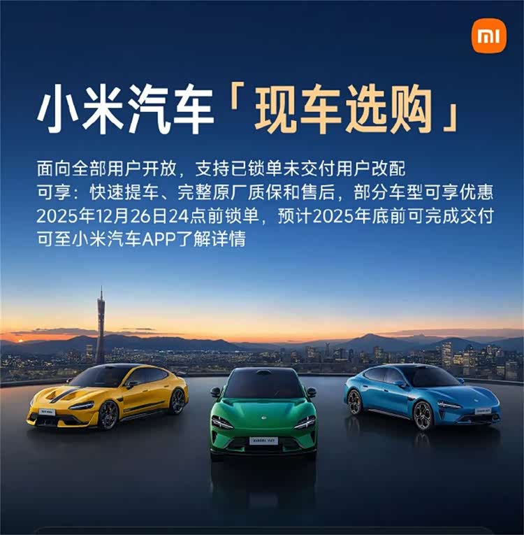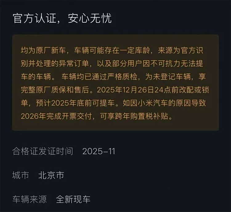 【文/财圈社&道哥说车 麻建宇】11月,小米汽车依旧给出了交付超过4万辆的成绩单,这也证明小米的火热并非仅在线上。但令人疑惑的是,进入12月,小米汽车开放了现车选购通道。根据官方消息,2025年12月26日24点前锁单,预计2025年底前可提车,如因小米汽车的原因导致2026年完成开票交付,可享跨年购置税补贴。
