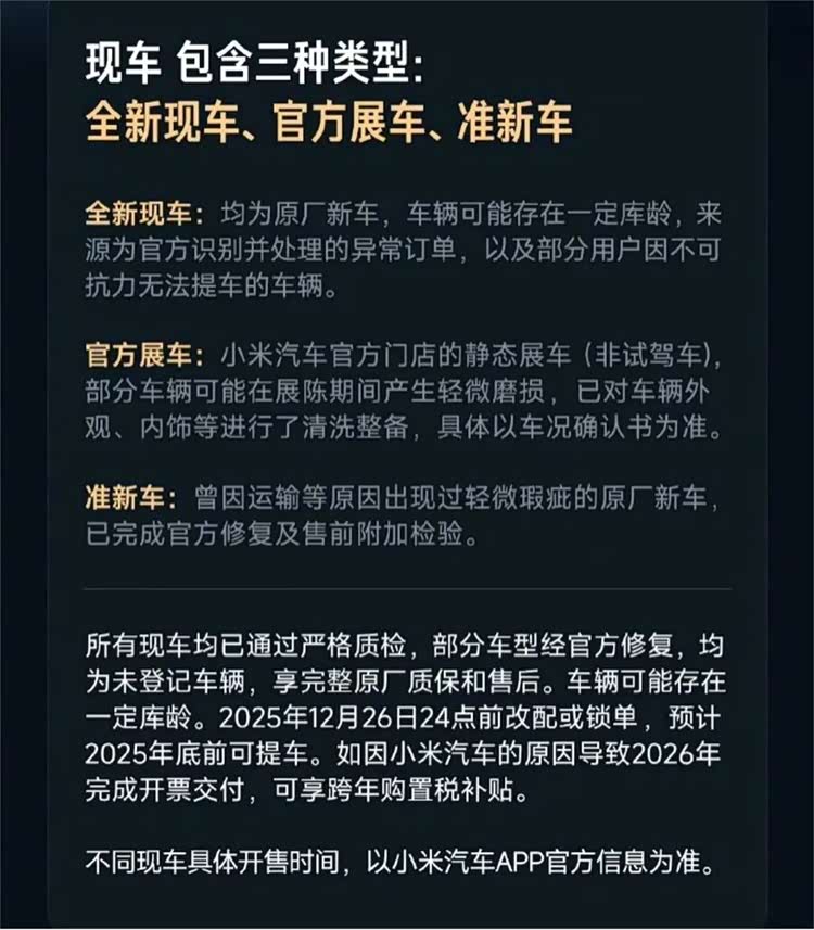 部分网友及报道指出,更多的现车或来自小米汽车订单的退订。根据小米全新现车的订购界面,全新现车均为原厂新车,车辆可能存在一定库龄,来源为官方识别并处理的异常订单,以及部分用户因不可抗力无法提车的车辆。
