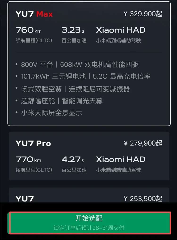 站在用户角度来看,小米汽车开放现车选购的一大好处就是极大程度上缩短了用户的提车周期。小米汽车小程序显示,小米SU7 MAX和Pro版本的交付周期在3—7周,而小米SU7标准版则需要26—29周;小米YU7 MAX版本交付周期在28—31周,Pro版本需32—55周;标准版则需要35—38周。