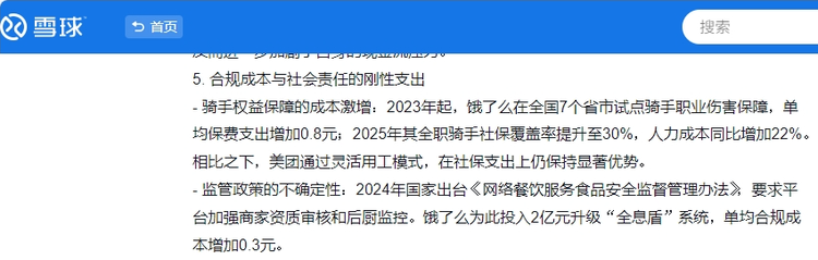 在合规转型方面,饿了么走在了行业前列。早在2024年,为响应国家监管要求,饿了么便率先行动。例如,投入2亿元升级“全息盾”食品安全系统,导致单均合规成本增加0.3元。同时,在多个省市试点骑手职业伤害保障,并计划到2025年将全职骑手社保覆盖率提升至30%,这一举措使得单均人力成本增加约0.8元。