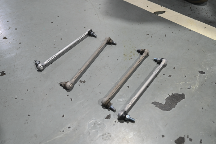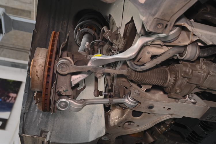 它的前下弯臂和前下直臂,我们直接换了总成。卸下小吊杆,将前稳定杆吊杆也一并更换,一步到位,恢复底盘应有的质感。