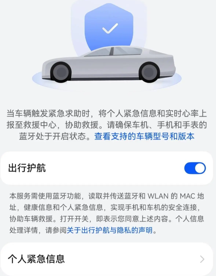 车家号·0浏览·2025-12-05 11:19 · 广东12 月 3 日消息,今年 5 月,华为 Mate 60、Pura 70 系列等手机开启了鸿蒙 HarmonyOS NEXT 5.0.1.120 版本升级,新增“出行护航”功能。当车辆触发紧急求助时,该功能可将个人紧急信息和实时心率上报至救援中心,协助救援。请确保车机、手机和手表的蓝牙处于开启状态。