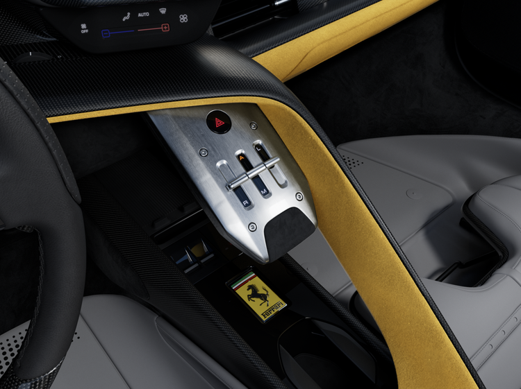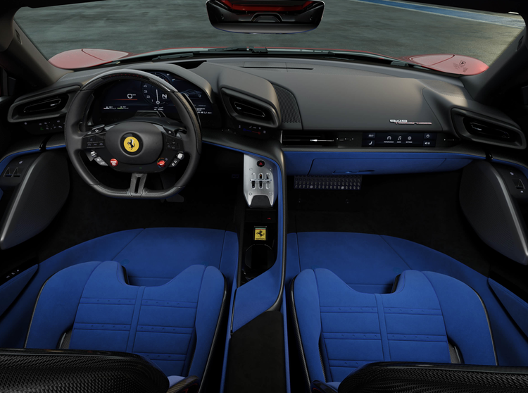 法拉利849 Testarossa的座舱也融入了很多赛车化的设计,配备了单座赛车所采用的水平仪表盘和座舱设计。中控台偏向于驾驶员一侧,并与操控岛一起进行了环抱式加固处理。前排配备了赛车一体式的桶装座椅设计,配备了六点式安全带设计,黑色Alcantara面料、麂皮绒面料以及黑色碳纤维复合装饰面板的交替运用,不仅带来了很强的视觉冲击力,也更加轻量化,还更加耐打理、更易清洁。激进的平底式多功能方向盘、大尺寸换挡拨片,源于法拉利F1的赛车波箱,提升了整车的赛车味道。16英寸曲面电子液晶仪表盘,副驾驶多媒体娱乐大屏,都让内饰极具科技质感。