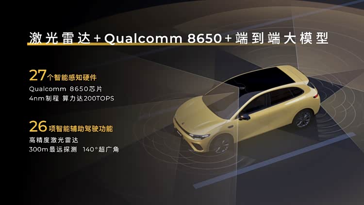 辅助驾驶方面,零跑Lafa5搭载含激光雷达在内的27个高精度感知硬件与高通8650芯片,支持端到端辅助驾驶,可实现高速领航辅助(NAP)、通勤领航辅助(CNAP),可以不依赖高精地图,实现领航辅助驾驶,未来将通过OTA实现城区领航辅助。