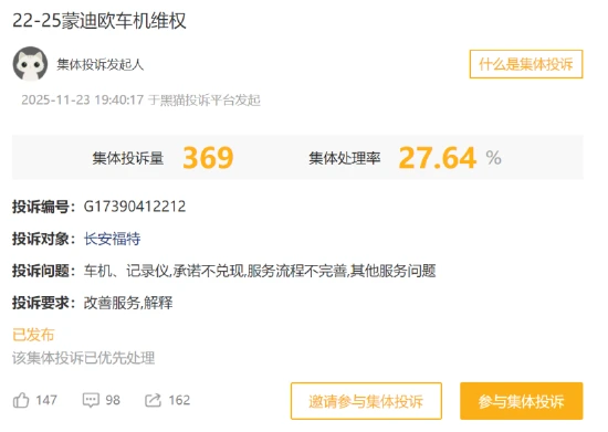 就在同一天,超过360名蒙迪欧车主在投诉平台发起集体维权,另有超过200名锐界L车主也加入维权行列。他们的核心诉求直指老款车机系统严重卡顿问题。