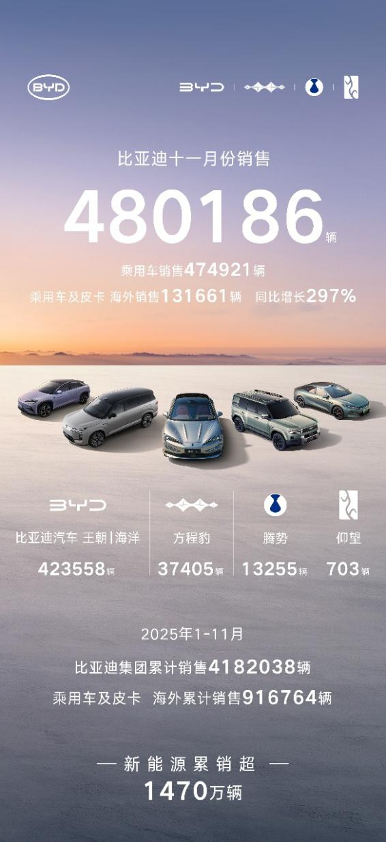 2025年11月,比亚迪销售超48万辆,其中海外销售突破13万辆,双双创年内新高。2025年1-11月,比亚迪累计销售已超418万辆,持续领跑全球新能源汽车市场,完成全年460万销量目标也是板上钉钉的事了。