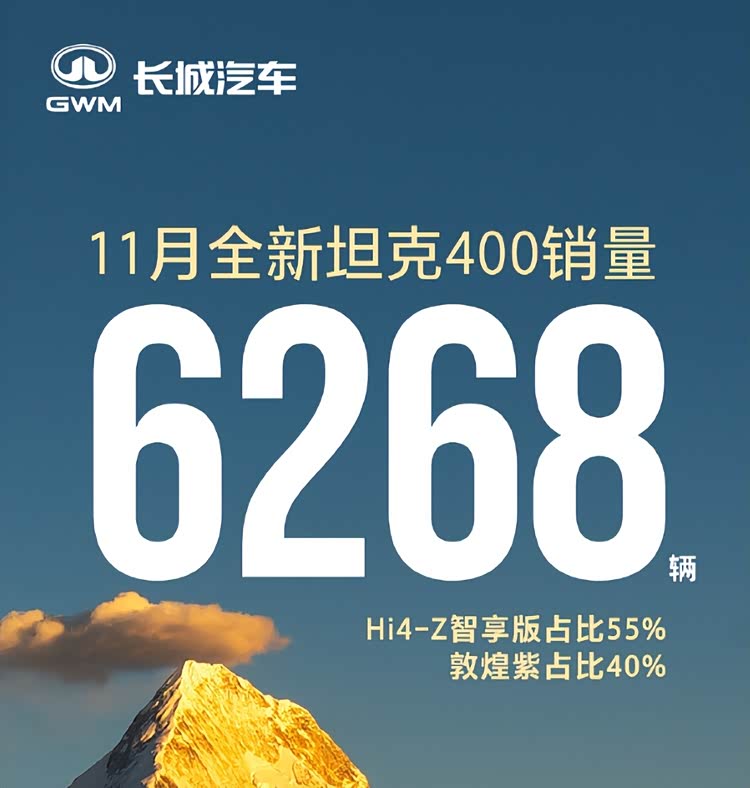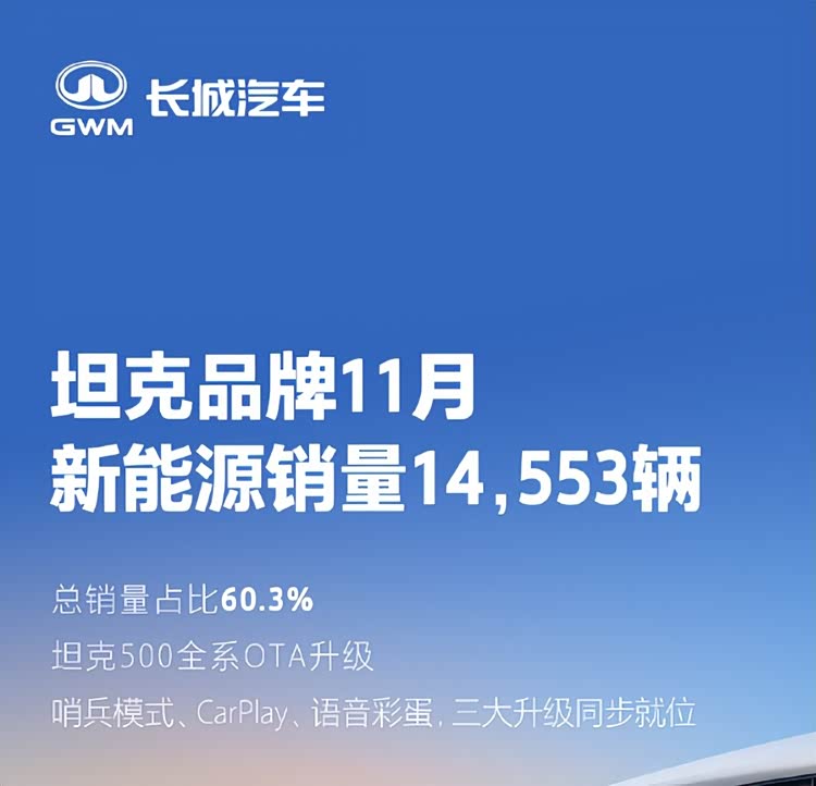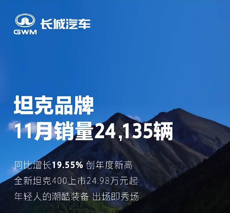 在2025年车市价格战打得昏天黑地的当下,不少品牌靠降价换销量,利润和品牌力双双承压。但有一个品牌却逆势而上,不仅11月销量交出24135辆、同比增长19.55%的成绩单,新能源车型占比还冲到了60.3%,更亮眼的是其30万元以上车型月销接近半壁江山——它就是坦克汽车。