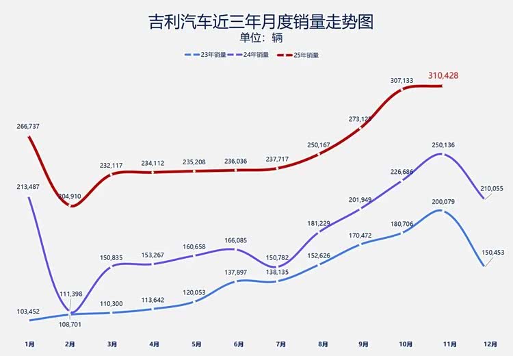 数据显示,今年11月份吉利汽车爆卖310428辆,同比劲增24%。