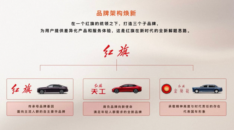 在这一背景下,如果仍然执行单一的品牌策略,很难做到与复杂多样的用户需求进行精准匹配。与此同时,更重要的是,红旗也具备了落地新品牌战略的能力,当前“天工纯电平台”、“鸿鹄混动平台”以及“九章智能平台”三大技术底座,以及覆盖多价格带的完善产品矩阵均已落地,完全能够支撑三个子品牌独立运营和差异化发展。