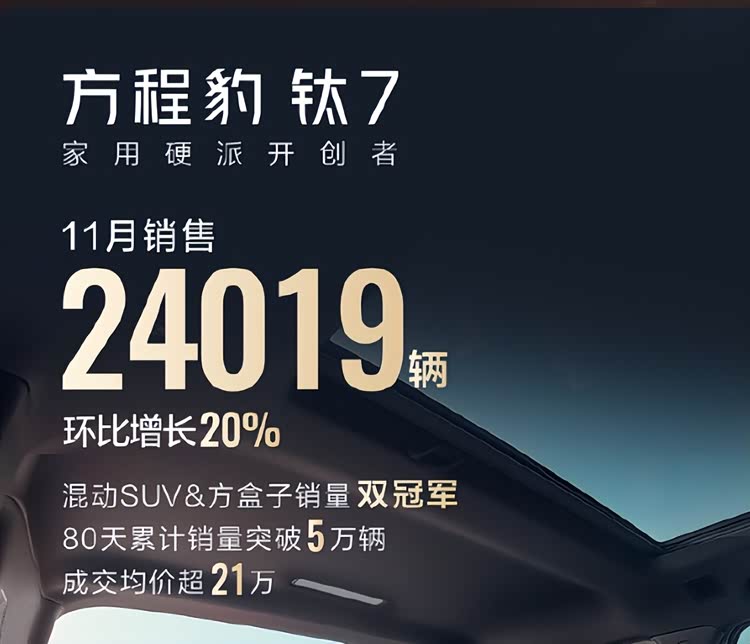 先说说扛起销量大旗的 钛7(参数|询价),这台车绝对是方程豹的“头功之臣”。11月单月卖了24019辆,占了品牌总销量的六成多,80天销量就累计破5万,还一举拿下混动SUV和方盒子车型的双料销冠,这个成绩放在硬派方盒子细分市场里,堪称“降维打击”。毕竟此前这个赛道的竞品,月销破万就算顶流了。
