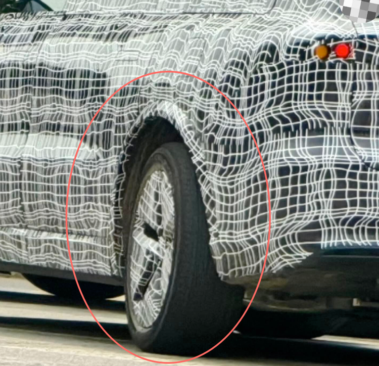 最关键的差异点当属后轮转向系统,测试车后轮明显内倾,配合主动悬架,转弯半径预计从6.15米缩减至5.5米内。