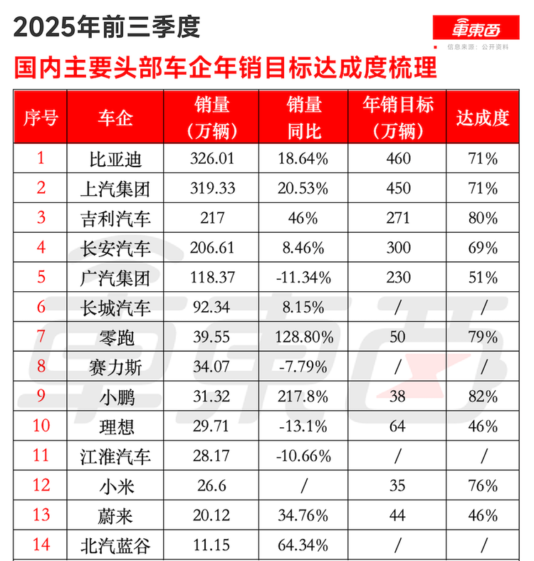 ▲国内主要车企2025年前三季度年销达成度对比