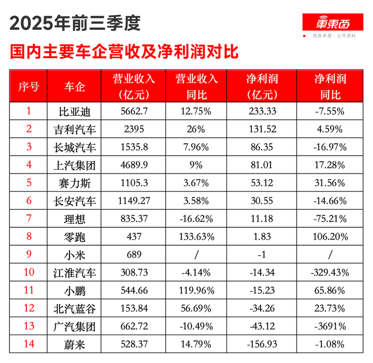 车东西12月4日消息,截至今天,国内已有14家主要车企发布了2025年第三季度财务报告。