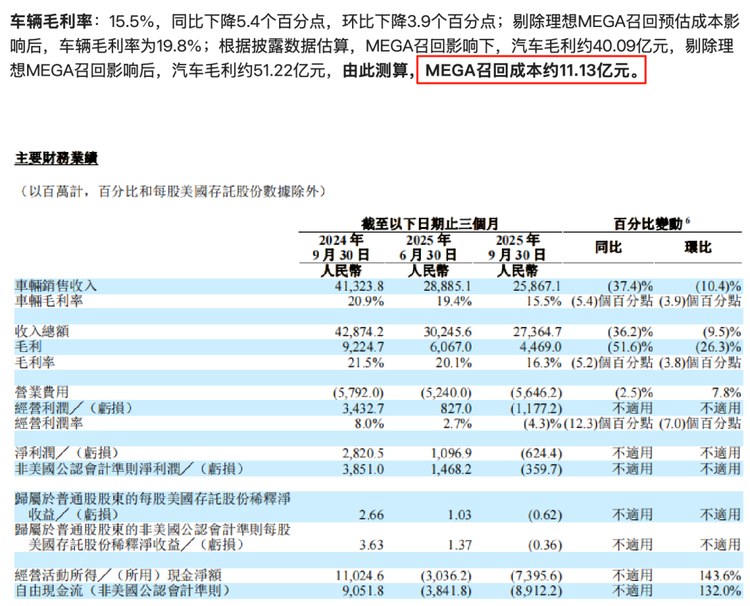 理想此次引发广泛讨论的电池策略,与其当前面临的经营压力密不可分。2024年第三季度财报数据显示,公司营收较去年同期下降超过三分之一,净利润由正转负。特别是MEGA车型的市场表现不及预期及相关召回事件,单此一项就计提了约11亿元的质保准备金,对公司财务状况造成了显著影响。