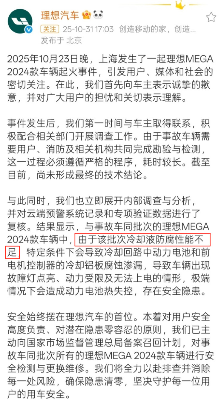 此前,MEGA车型的起火事故内部调查显示,原因之一是该车采用了规格相对较低的冷却液。这已是理想在涉及安全的核心供应链环节上进行“成本优化”的公开记录。如今,在更为关键的电池系统上再现类似策略,自然引发了消费者的疑虑:这是否意味着理想形成了一套系统性的降本逻辑?