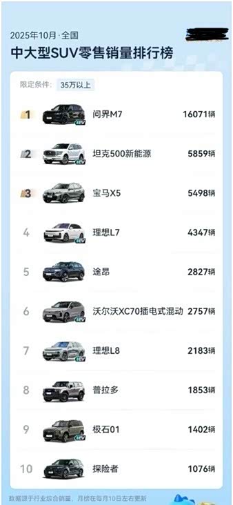 在变幻莫测的车市浪潮中,一个数字往往比千言万语更有说服力:单月销量1.6万台。这不仅让全新问界M7在2025年10月成功加冕35万级中大型SUV销量冠军,更在坦克500新能源、宝马X5等一众实力选手中脱颖而出,树立了一个清晰的价值标杆。