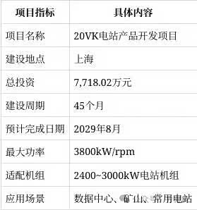 其中7,718.02万元将用于新建"20VK电站产品开发项目",该项目定位大功率电站机组市场,具体参数如下: