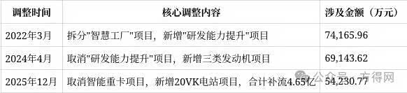 动力新科于2021年10月通过发行股份及支付现金购买资产方式募集配套资金净额19.809788亿元,原计划投入"智慧工厂"和"新一代智能重卡"两大项目。经过2022年、2024年两次调整后,本次为第三次重大募资用途变更,具体调整轨迹如下: