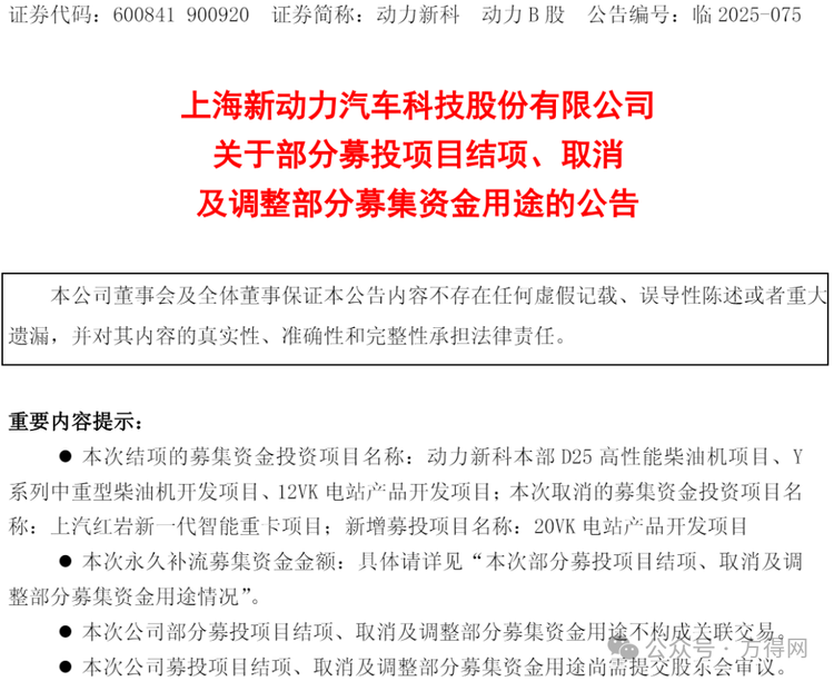 上海新动力汽车科技股份有限公司(下称"动力新科")12月3日发布公告,宣布对2021年募集的19.809788亿元资金用途进行重大调整。公司拟终止"新一代智能重卡"项目并将剩余3.75亿元募集资金永久补充子公司流动资金,同时将部分结项项目节余资金7718万元投入新项目开发,其余9005万元用于补充公司流动资金。本次调整尚需提交股东会审议。