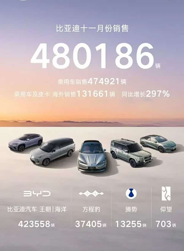 品牌矩阵方面,王朝网和海洋网仍然是销售主力,11月贡献了423,558辆;方程豹品牌表现亮眼,销量为37,405辆,同比增长339%;仰望品牌销量增长至704辆。