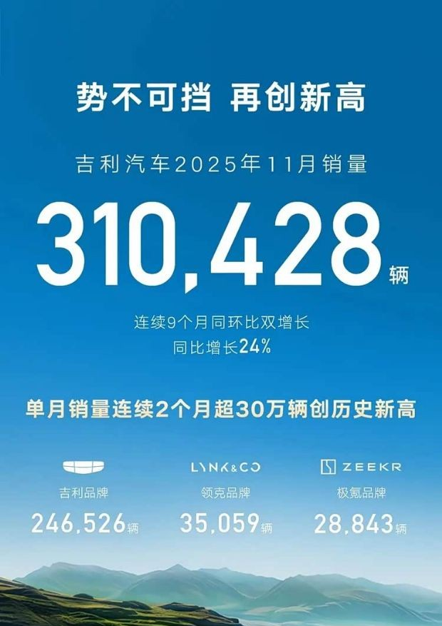 吉利汽车11月销量达310,428辆,同比增长24%,连续9个月实现同环比双增长。