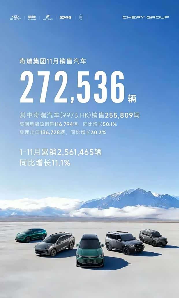 奇瑞集团11月销量为272,536辆。 其中,奇瑞汽车股份有限公司(上市公司主体)11月销量为255,809辆,同比下降约2.82%,环比下降3.06%,是五强中唯一出现环同比双下滑的企业。