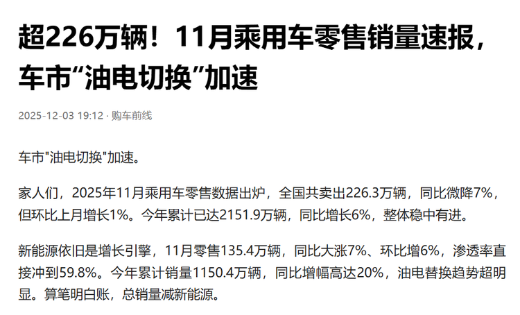 11月车市整体增长动能不足。乘联会初步统计显示,11月狭义乘用车零售总市场预计为226.3万辆,环比增长1%,同比下降7%。