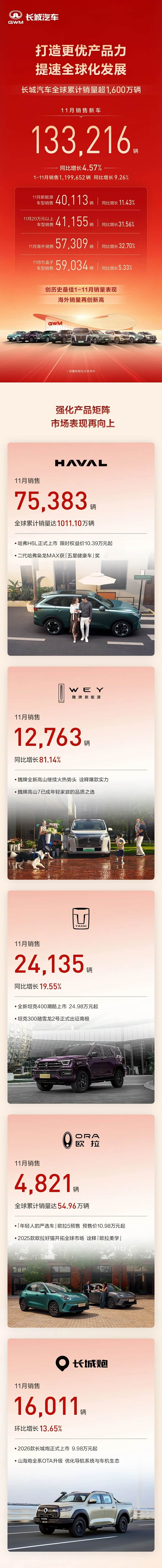 长城汽车11月销量为133,216辆,同比增长4.57%。
