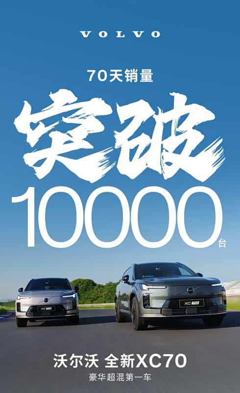 12月5日,沃尔沃官方披露,旗下全新XC70累计销量正式突破1万辆,而距其正式上市仅70天便达成这一里程碑,一举实现市场“开门红”。这一成绩不仅印证了消费者对这款“全能型”豪华混动车型的高度认可,更充分彰显了其“豪华超混第一车”的产品硬实力。
