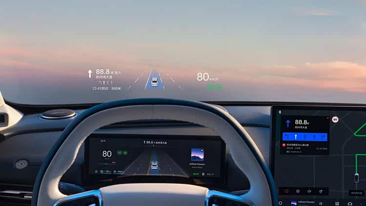 导航体验的革新是智能出行的关键一环。银河A7首发搭载高德810地图导航,其突破性在于深度融合了车辆感知数据与云端路况。可视化车道引导功能可在复杂立交或匝道提前清晰指示最佳路径,巡航红绿灯功能则能在接近路口时实时显示读秒,极大缓解了城市通勤的预判焦虑。这套系统与16.6英寸大画幅W-HUD联动,将关键信息投射于挡风玻璃上,高达12000nit的亮度确保在强光下依然清晰可见,实现了视线不离路面的安全交互。