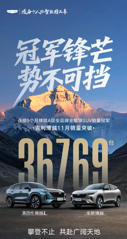 车家号·0浏览·2025-12-05 17:32 · 江西在博越系列持续领跑A级SUV市场之际,全新第四代博越L以空间魔法师的形象登场,不仅拥有越级乘坐体验,更在智能驾控上带来颠覆性突破。目前,吉利博越系列已经连续5个月蝉联A级全品牌全能源SUV销量冠军,吉利博越11月销量突破36769辆,冠军锋芒势不可挡。