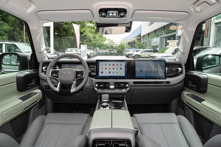 进入车内,整体的布局与上代车型截然不同,把豪华感与科技感融合到一起,更像是豪华车的表现,四幅式多功能方向盘的握感很不错,两侧的按键反馈也很清晰,搭配10.25英寸全液晶仪表使用很方便,中控部分搭载两块 12.8英寸大屏幕,分别为中控屏幕和副驾驶娱乐屏幕,支持手机互联和语音识别控制功能,使用体验很不错,另外,在中控屏幕下方还保留了一排实体按键,对于越野车来说是一个比较实用的设计。