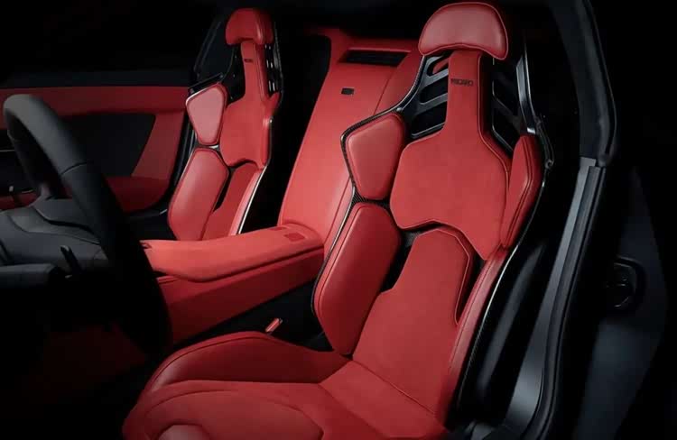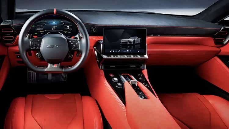 内饰部分主打的运动机械风,没有偏向新能源风。搭载定制的12.3英寸仪表盘、全新GR专属方向盘+换挡拨片,以及一块尺寸不大的悬浮式中控屏,中控布局不能算惊艳。但是车内采用了大面积的红色皮革+Alcantara材质包覆,视觉观感相当炸裂。而且座椅采用了碳纤维材质的Recaro桶形座椅,兼具了运动和豪华。