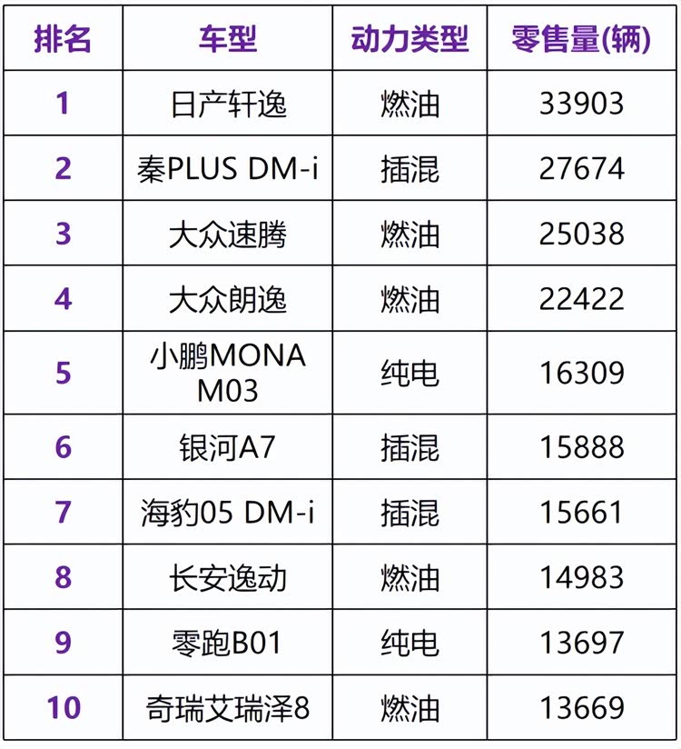 上表我们统计了今年10月份,售价10万元左右三厢轿车的销量Top 10,其中包括5款燃油车和3款插混车,纯电车型只有MONA M03和零跑B01两款,且它们加到一起的销量,依然不及日产轩逸。