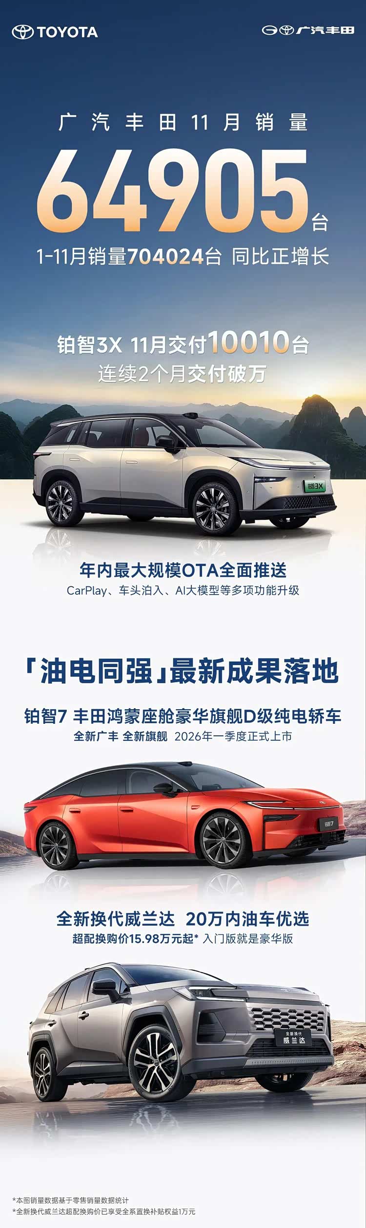 就在刚刚结束的11月份,广汽丰田的铂智3X交出了10,010台的销量成绩,连续两个月销量破万。而广汽丰田11月整体销量也达到了64,905台,1-11月累计销量为704,024台,仍然实现同比正增长。