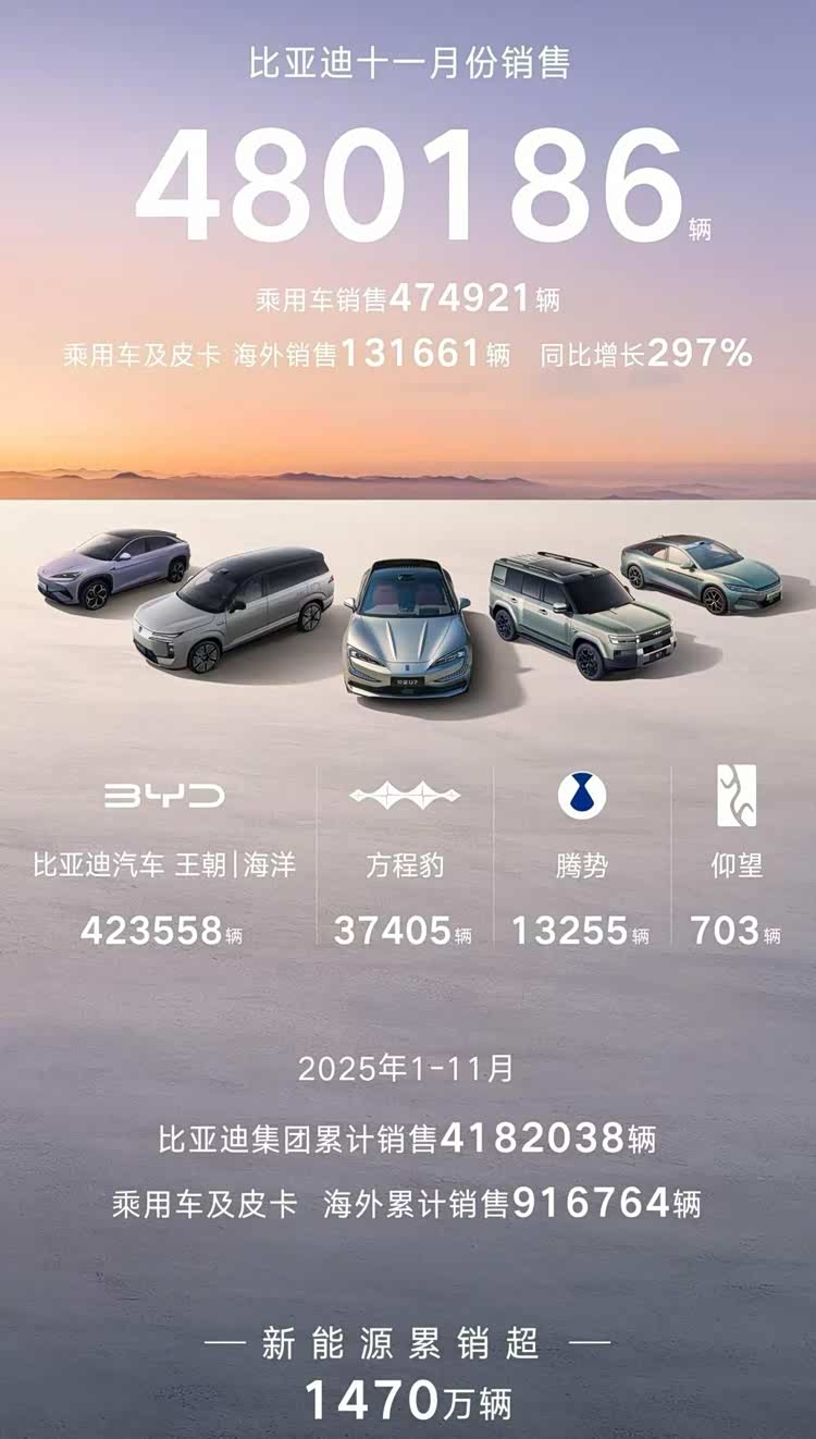 今年1-11月,比亚迪累计销量已破418万辆,全年目标完成率91%,基本提前锁定2025年销冠。更值得记一笔的是,比亚迪全球新能源车累计销量突破1470万辆,这规模相当于给全球每座城市都塞满了比亚迪的车!