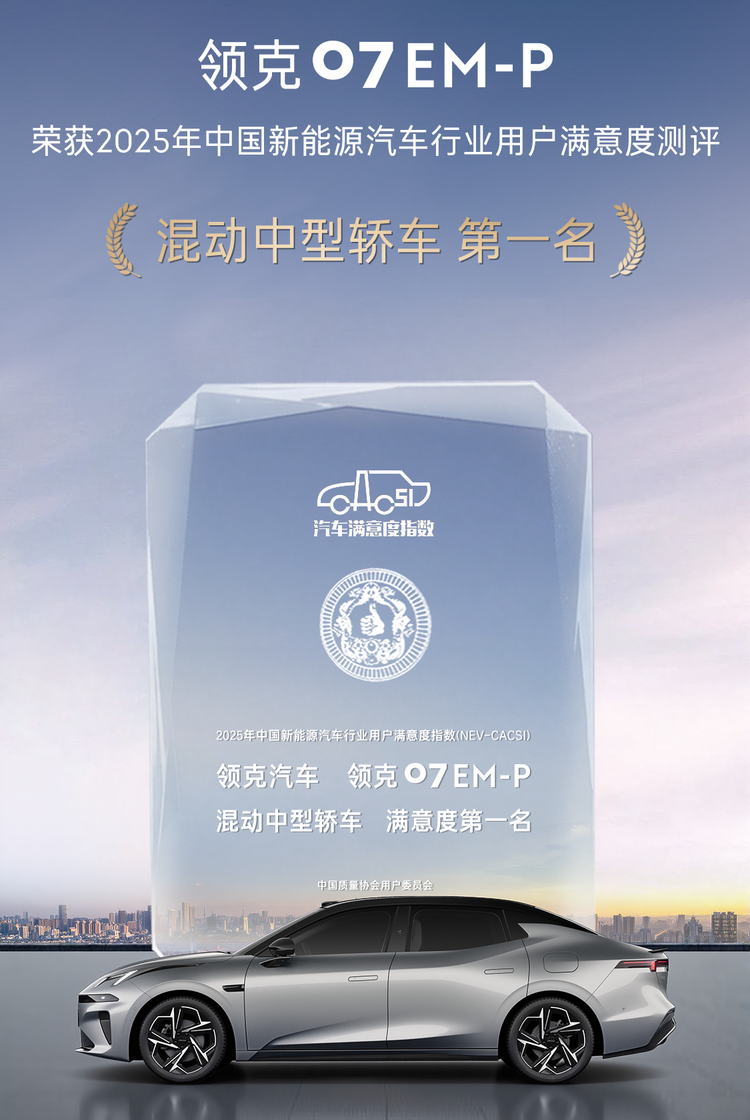 当下不少车企都在强调用户思维与品质至上的理念,但理念能否落地,需要第三方权威体系的检验。毕竟空有口号没有实际产品力支撑,无法真正获得用户长期认可。已运行24年的CACSI测评,针对新能源领域衍生出的NEV-CACSI测评,从多个核心维度对车型进行全方位考评,既是用户满意度的试金石,也是车企理念落地的验金石。2025年该测评结果显示, 领克07 EM-P(参数|询价)斩获混动中型轿车用户满意度第一名,这一成绩不仅是其产品力的有力证明,更体现出其将用户思维与品质理念贯彻到产品研发与生产全流程的成果,获得了用户与行业的双重认可。