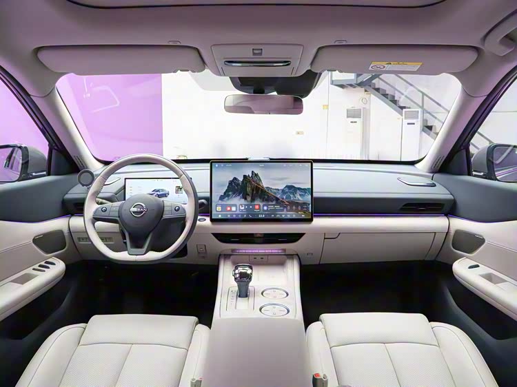 车内保留了传统挡把,取消了很多按键,但提供了原厂定制可拓展式物理按键,提升盲操便利性,另外挡把前方也提供有手机无线充电。中控台采用3D MESH软包工艺,搭配仿麂皮材质和高级皮质以及金属饰条,可接触面积的软包覆盖率达到了90%,档次感大幅提升,且采用环保材质,座舱获中汽中心“零甲醛”汽车认证。内饰配色有晨曦岚白、穹宇黑灰和曜夜黑红3种配色供选择。