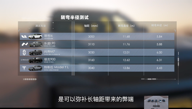 最后咱们看一个数据,这个数据直接影响平时开车走街串巷、窄路掉头时车子的灵活性,它就是“转弯半径”。经过实测,问界M7、领克900和特斯拉Model Y L的转弯半径都在6米以上,这样的数据就导致你平时窄路掉头的时候需要多打几把轮,后面的车滴滴你就记住了——忍着,别急。